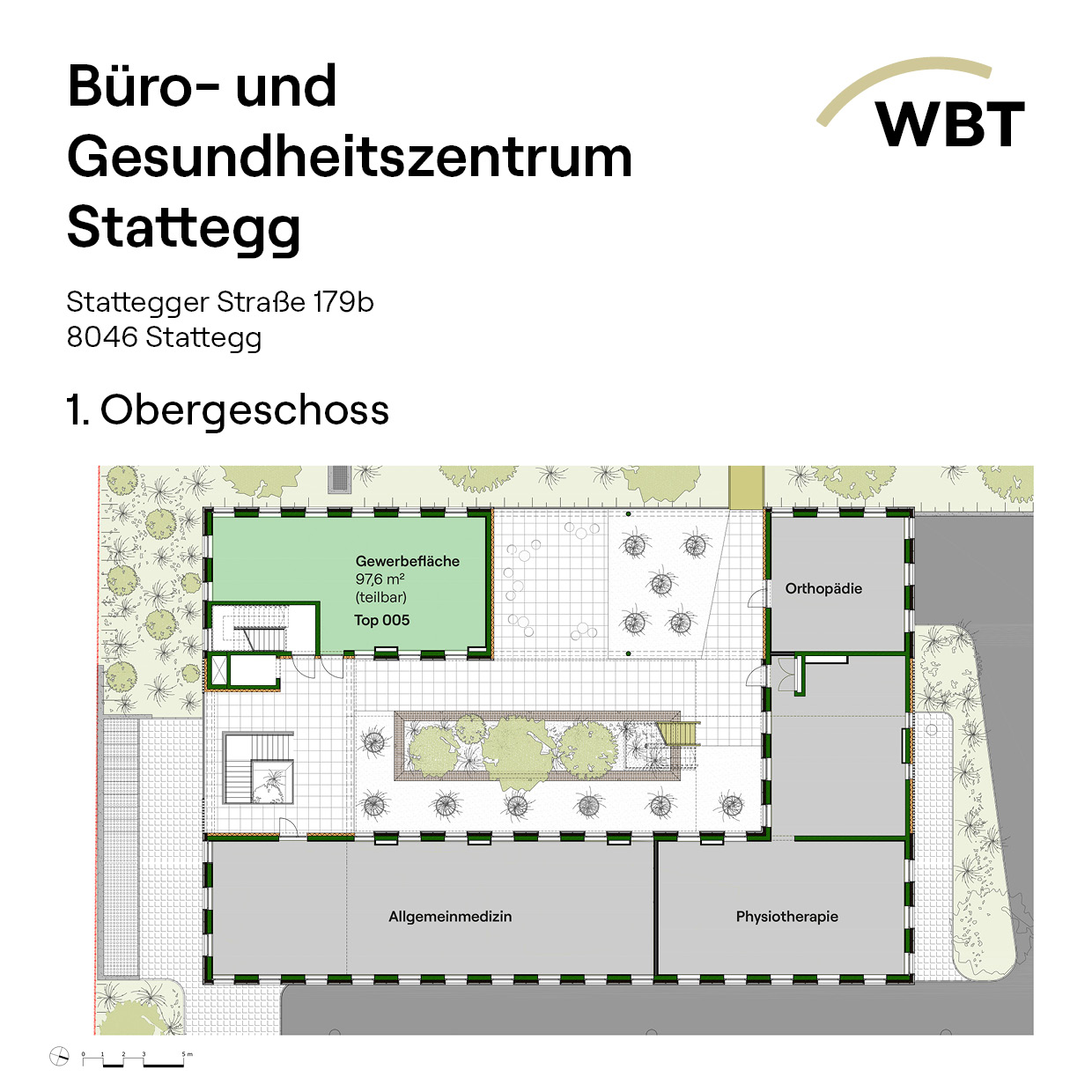 In den Obergeschossen gruppieren sich moderne Büro- und Praxisräume rund um ein lichtdurchflutetes Foyer, das Helligkeit und eine angenehme Arbeitsatmosphäre schafft. Im 1. Obergeschoss steht nur noch eine teilbare Gewerbefläche mit 97 m² zur Verfügung.